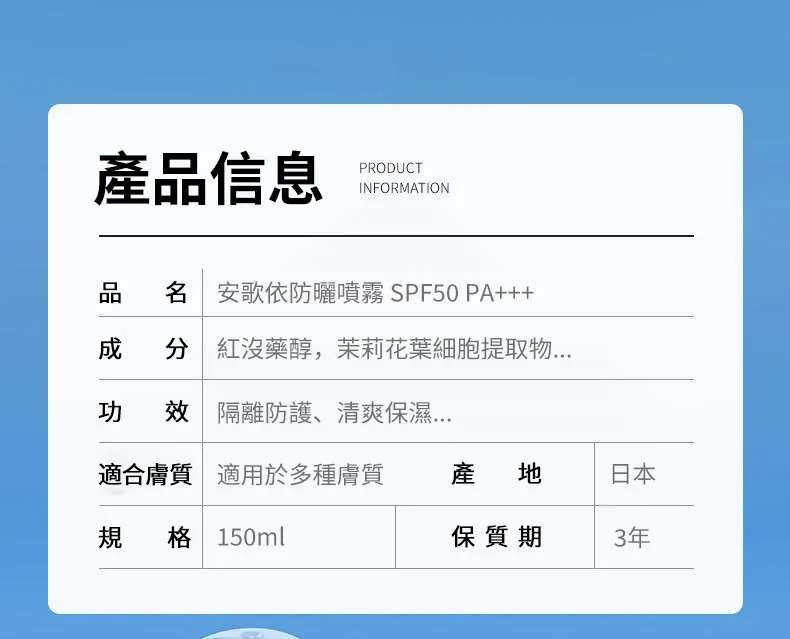 11分鐘前安歌依光圈防曬噴霧,細密噴頭設計 噴頭360°可旋轉自然膚惑,隔離防曬一瓶搞定 - 限時搶購「安歌依光圈防曬噴霧」2入78%用戶的選擇!NT$998【限時免運】
